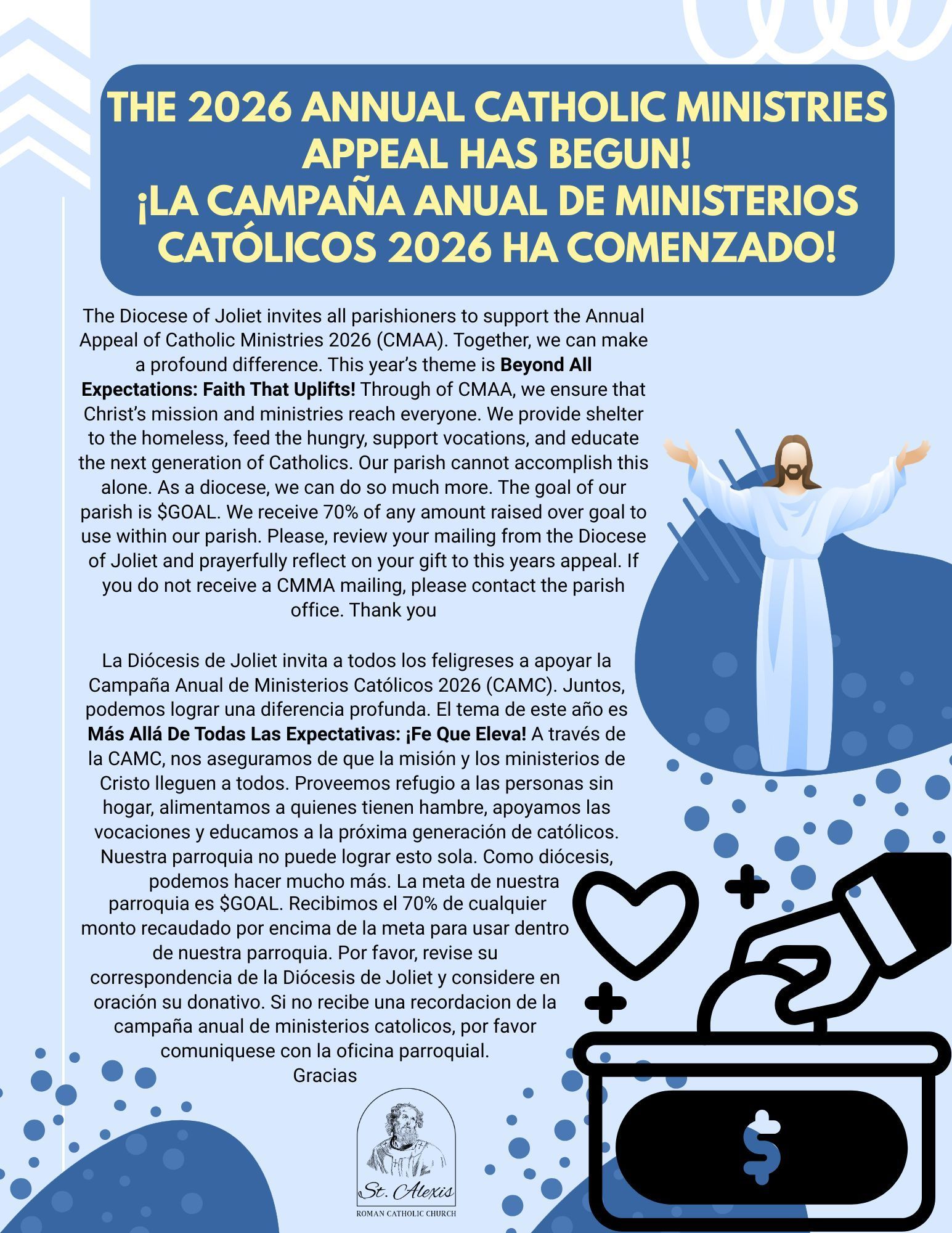 The St. Alexis family is a community blessed by God with a diversity of cultures and languages. Celebrating that richness, we reach out to all inviting them to gather at the table of the Lord as one People. In openness to the Gospel, we form ourselves as stewards of the Lord's gifts to create a community of faith that is unifying, supporting and nurturing.